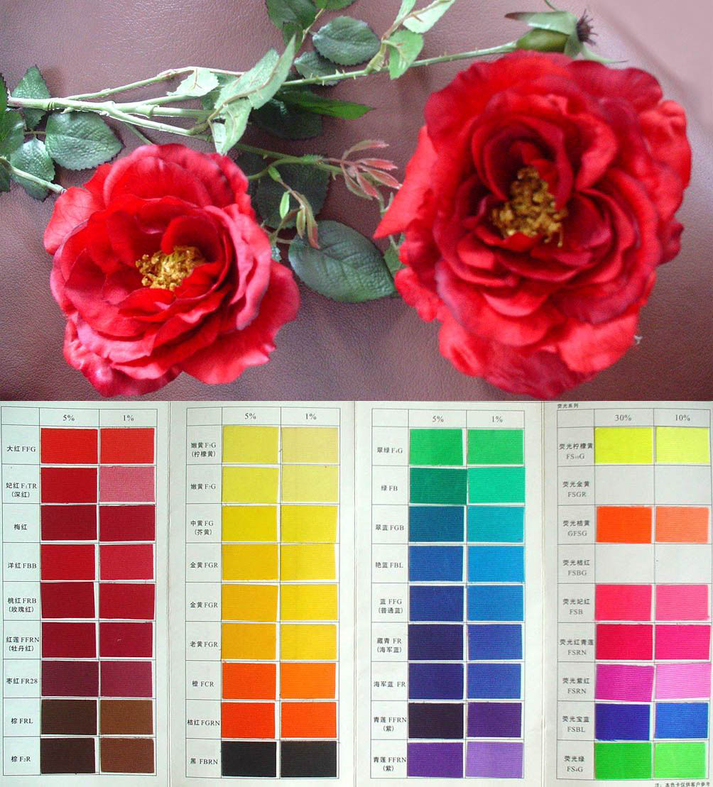直接描色或加水开稀后喷色,色泽艳丽,附着力好,漆膜干爽,无味、环保、安全,用于绒布花辩染色用。